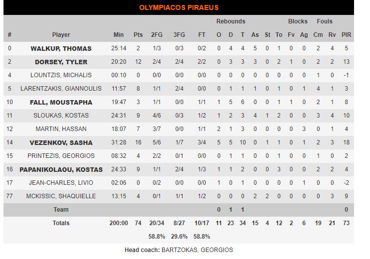 Double– double από τον εκπληκτικό Βεζένκοφ με 16 πόντους και 10 ριμπάουντ , καθοριστικοί στο τέλος Παπανικολάου, Ντόρσεϊ (9 και 12 πόντοι αντίστοιχα), σπουδαία δουλειά από τον Λαρεντζάκη και τον Ντόρσεϊ.