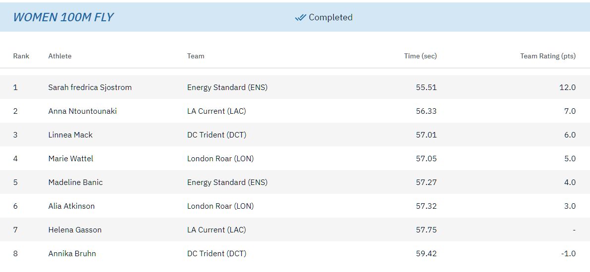 Η Χανιώτισσα πρωταθλήτρια σε αγώνας στο Αϊντχόφεν όπου διεξάγεται η 16η αγωνιστική της ISL 3, κολύμπησε σε 56.33 και βελτίωσε τη δική της επίδοση που ήταν 56.35 από το πρόσφατο Ευρωπαϊκό πρωτάθλημα στο Καζάν (2/11/2021).