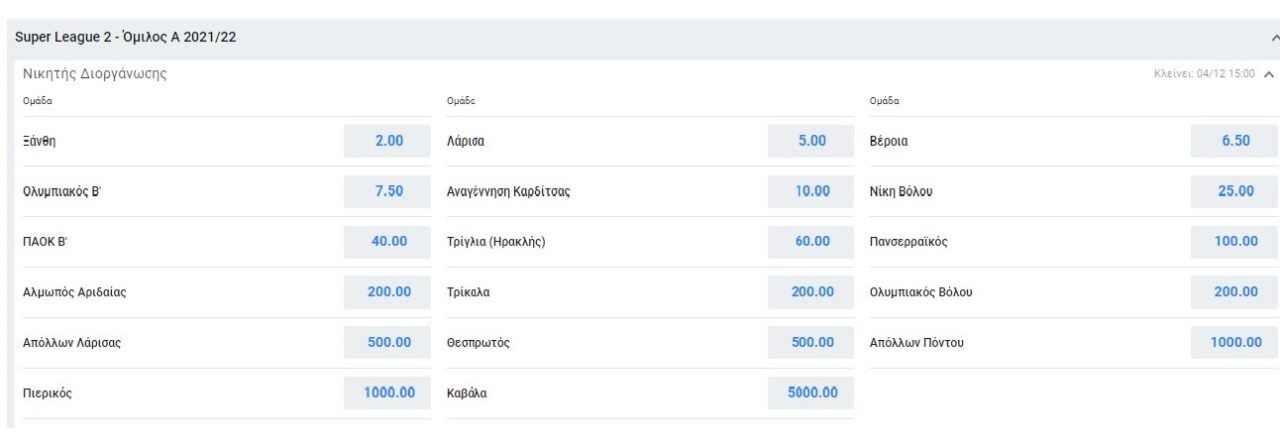Την ίδια ώρα, στον Βόρειο Όμιλο ως φαβορί δίνεται η Ξάνθη για την πρώτη θέση, με απόδοση 2.00, ενώ ακολουθούν Λάρισα με 5.00, Βέροια με 6.50 και Ολυμπιακός Β’ στην απόδοση 7.50