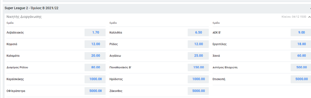 Σύμφωνα με τις αποδόσεις, ο Λεβαδειακός είναι το φαβορί για την κατάκτηση της πρώτης θέσης στον Νότιο Όμιλο της Super League 2, με τις Καλλιθέα, ΑΕΚ Β’, Κηφισιά και Ρόδο να ακολουθούν, με τις ομάδες της Κρήτης να είναι… αρκετά πίσω, σύμφωνα με τις αποδόσεις της στοιχηματικής εταιρείας stoiximan.gr