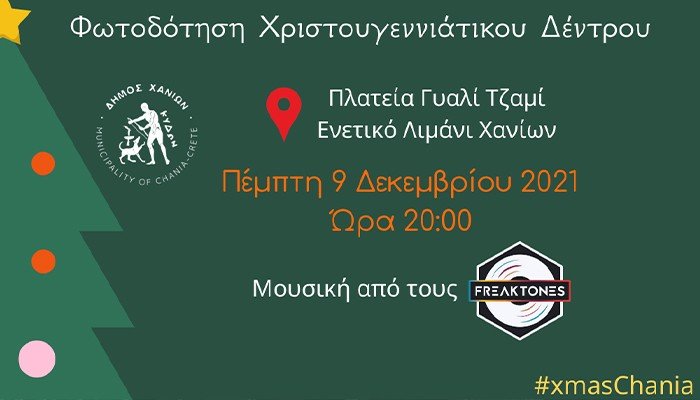 Η φωτοδότηση του νέου Χριστουγεννιάτικου δέντρου στην πλατεία δίπλα από το Γιαλί Τζαμί θα πραγματοποιηθεί σήμερα, Πέμπτη 09 Δεκεμβρίου 2021, στις 20.00, δίνοντας το σύνθημα για την επίσημη έναρξη των εορταστικών εκδηλώσεων, που διοργανώνουν ο Δήμος Χανίων, η Κ.Ε.Π.ΠΕ.ΔΗ.Χ. – Κ.Α.Μ. και το Δημοτικό Λιμενικό Ταμείο Χανίων.