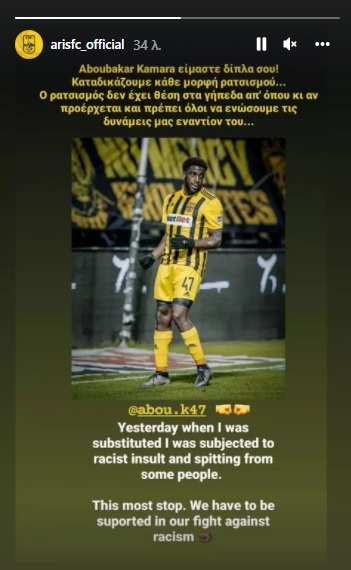 «Αμπουμπακάρ Καμαρά είμαστε δίπλα σου! Καταδικάζουμε κάθε μορφή ρατσισμού… Ο ρατσισμός δεν έχει θέση στα γήπεδα απ’ όπου κι αν προέρχεται και πρέπει όλοι να ενώσουμε τις δυνάμεις μας εναντίον του…», αναφέρει η ΠΑΕ σε ανάρτηση στα social media, την οποία έκανε repost ο ισχυρός άνδρας της.