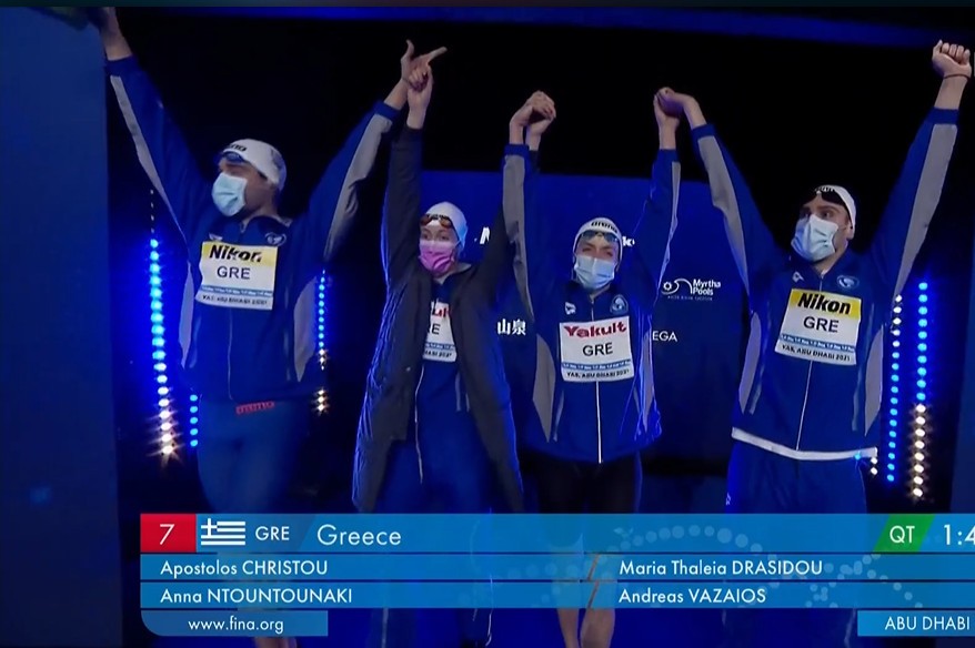 Αυτή η έβδομη θέση αποτελεί μια τεράστια επιτυχία καθώς με χρόνο 1:39.51 η Εθνική μας ομάδα στην μικτή Ανδρών – Γυναικών 4Χ50 μ. μικτή ομαδική με τους Απόστολο Χρήστου (Ύπτιο 23.34), Μαρίλεια Δρασίδου (Πρόσθιο 30.04), Άννα Ντουντουνάκη (Πεταλούδα 25.01) και Ανδρέα Βαζαίο (Ελεύθερο 21.12), που κολύμπησε στον τελικό στο Άμπου Ντάμπι.