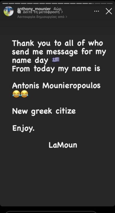 “Σας ευχαριστώ όλους για τα μηνύματα και τις ευχές. Από σήμερα το όνομά μου είναι Αντώνης Μουνιερόπουλος. Νέος Έλληνας πολίτης”