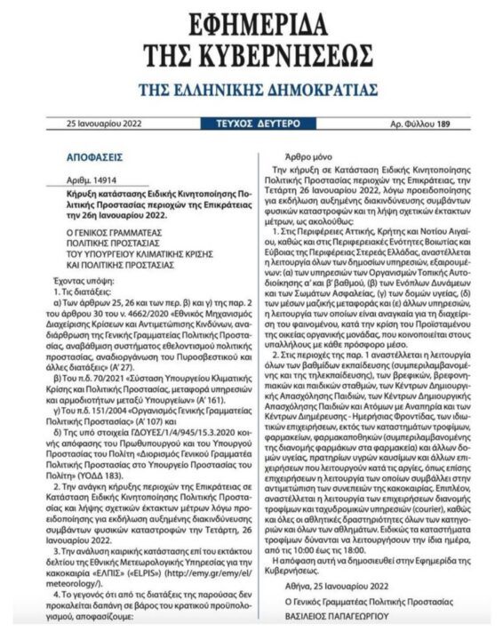 Σύμφωνα με την απόφαση της Κυβέρνησης η Κρήτη εντάσσεται, για την Τετάρτη 26 Ιανουαρίου μεταξύ των περιφερειών για εκδήλωση αυξημένης διακινδύνευσης συμβάντων φυσικών καταστροφών και κατά συνέπεια αναστέλλονται όλες οι αθλητικές δραστηριότητες.