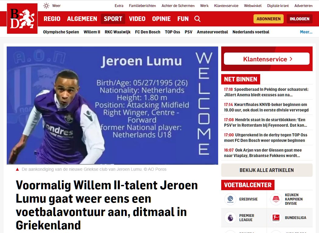 Είναι μόλις 26 ετών, αλλά ο Jeroen Lumu είναι ήδη στον δέκατο τέταρτο σταθμό στην καριέρα του. Ο επιθετικός της Μπρέντα, που αγωνίστηκε στην Ολλανδία για τη Βίλεμ ΙΙ, τη Χέρενφεν και την Ντόρντρεχτ, θα αγωνιστεί στον ΑΟ Πόρου από την Ελλάδα”, αναφέρει μεταξύ άλλων.