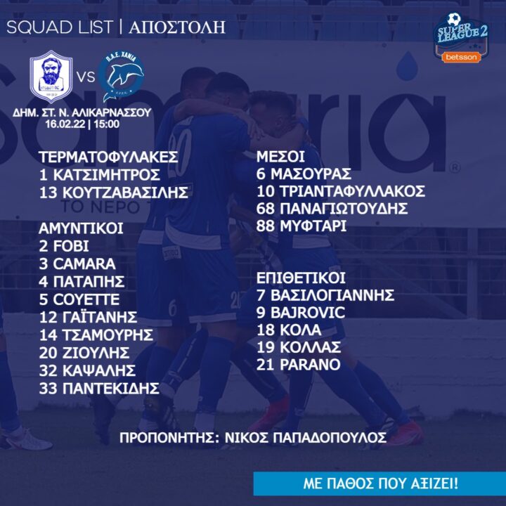 Τα Χανιά ολοκλήρωσαν την προετοιμασία τους για το εντός έδρας Κρητικό ντέρμπι με τον Ηρόδοτο, με τον Νίκο Παπαδόπουλο να ανακοινώνει την αποστολή της ομάδας, στην οποία συμπεριέλαβε 20 ποδοσφαιριστές, με τους Κάρλος, Βάρκα και Νικόλη να απουσιάζουν.