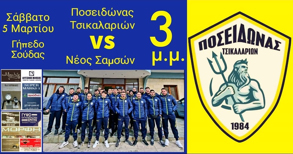 Ο Ποσειδώνας Τσικαλαριών υποδέχεται τον Νέο Σαμψών το Σάββατο (5/3) στην Σούδα, σε ένα ντέρμπι με πολύ μεγάλη βαθμολογική σημασία, με την την ομάδα των Τσικαλαριών να κάνει κάλεσμα στον κόσμο για να βρεθεί στο γήπεδο.