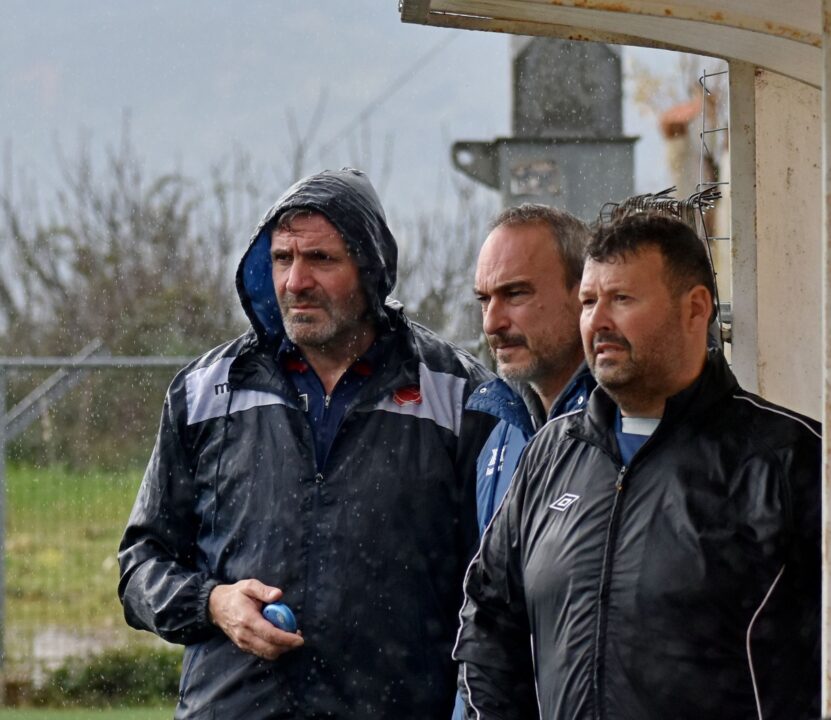 Υπο βροχή παρακολούθησε το παιχνίδι το προπονητικό επιτελείο της Α.Ε Κυδωνίας (Σχοιναράκης – Ριτζάκης – Ξενάκης)