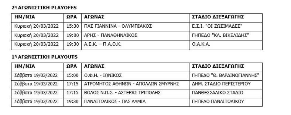 Παράλληλα έγινε γνωστό το πρόγραμμα και της 2ης αγωνιστικής των play offs όπου ξεχωρίζει το ντέρμπι της ΑΕΚ με τον ΠΑΟΚ που θα διεξαχθεί στις 19.30 το απόγευμα της Κυριακής 20 Μαρτίου.