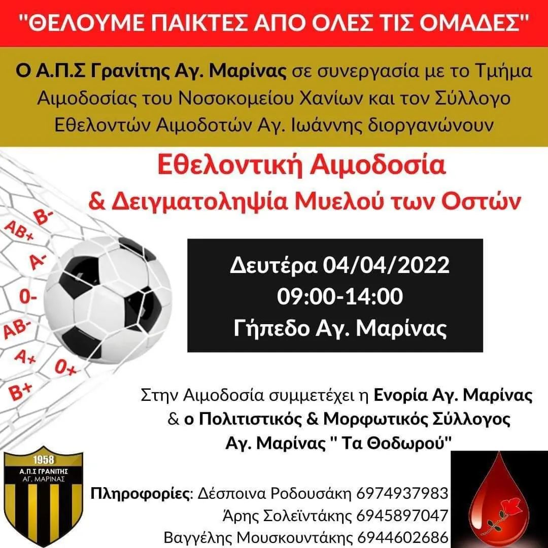 Η ομάδα του Γρανίτη καλεί τον κόσμο να διαθέσει λίγα λεπτά από το χρόνο του για να βρεθεί την Δευτέρα 4 Απριλίου στο γήπεδο της Αγίας Μαρίνας για εθελοντική αιμοδοσία και δειγματοληψία του Μυελού των Οστών.