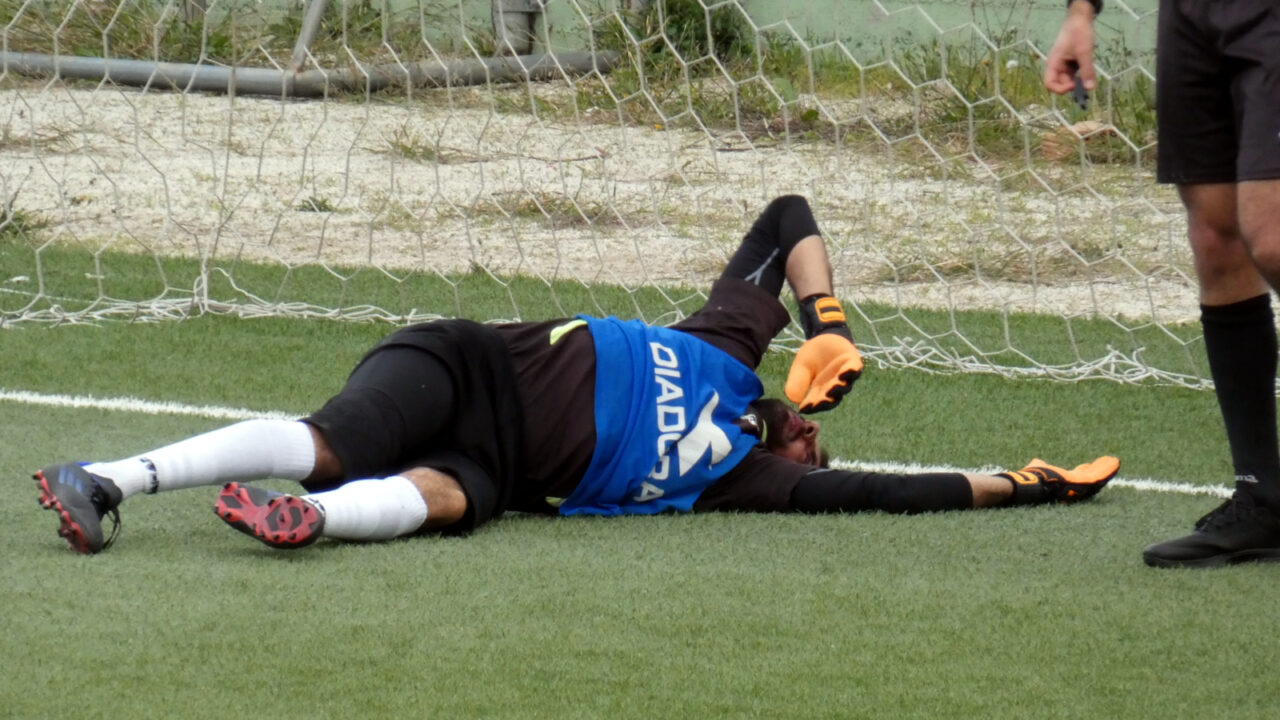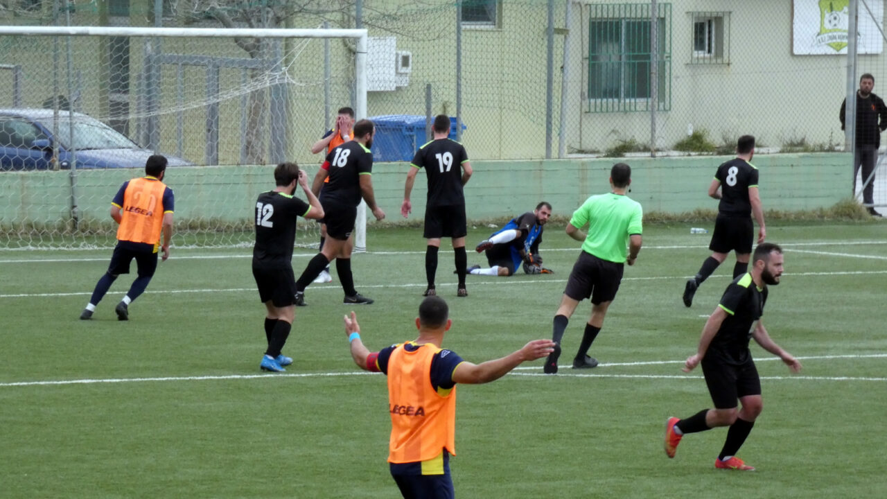 Ο τραυματισμός του τερματοφύλακα της Θύελλας, Κατερουδάκη και η αναγκαστική αλλαγή του με τον Τσαβαρή που μπαίνει στον αγωνιστικό χώρο (στην παρακάτω φώτο).