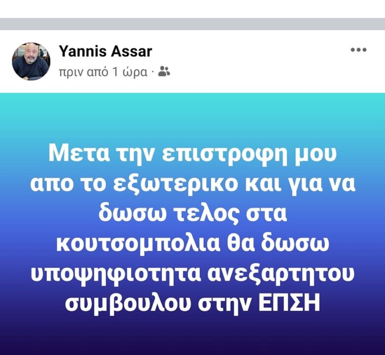 “Μετά την επιστροφή μου από το εξωτερικό και για να δώσω τέλος στα κουτσομπολιά θα δώσω υποψηφιότητα ανεξάρτητου συμβούλου στην ΕΠΣΗ”