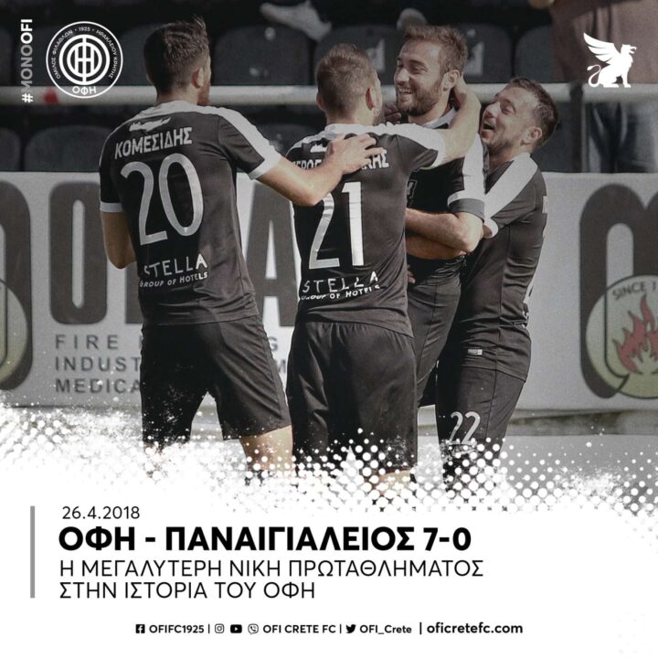 Με τον Νίκο Παπαδόπουλο στον πάγκο του, ο ΟΦΗ είχε πανηγυρίσει την μεγαλύτερη σε εύρος νίκη της ιστορίας του μέχρι σήμερα σε αγώνα πρωταθλήματος, όταν στις 26 Απριλίου του 2018, επιβλήθηκε με το εντυπωσιακό 7-0 του Παναιγιάλειου και ουσιαστικά κλείδωσε την άνοδο του στην Σούπερ Λίγκ.