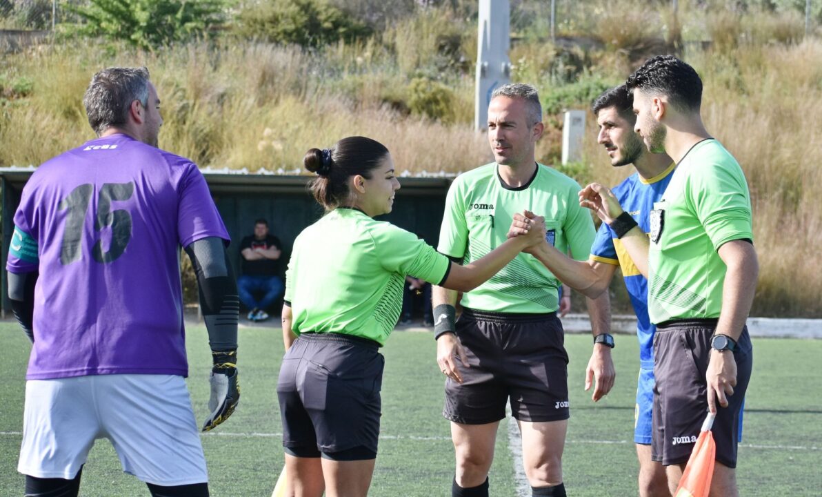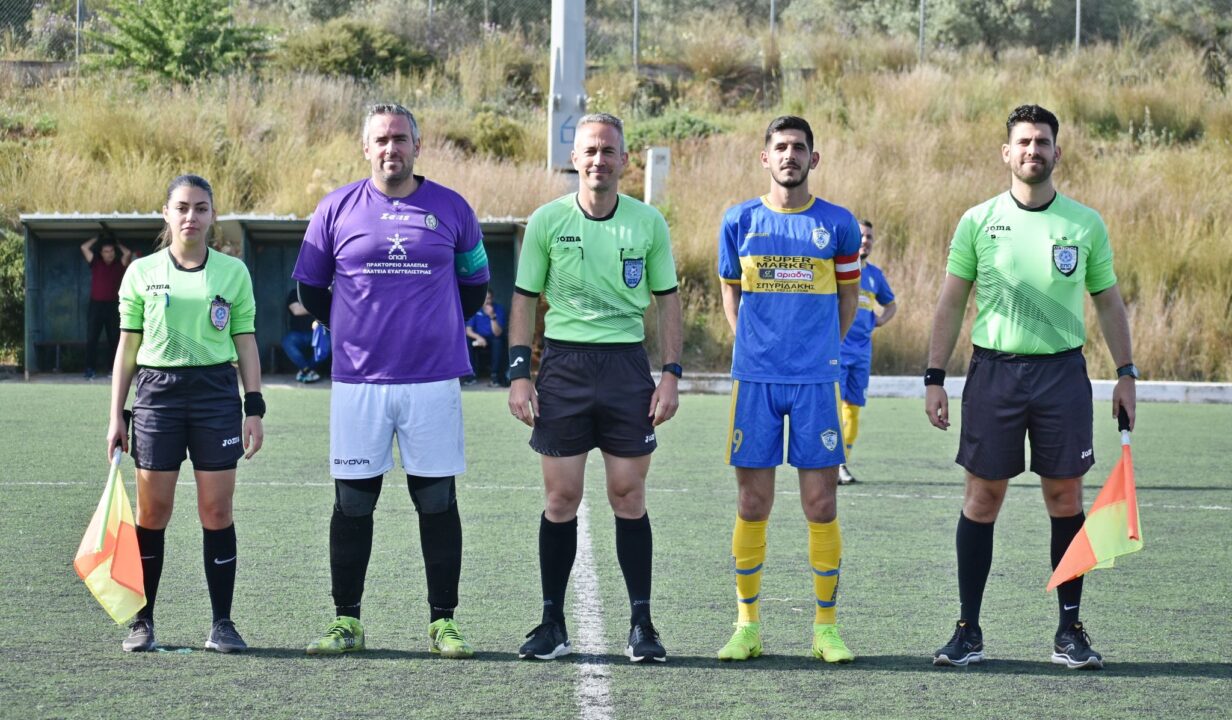 Οι διαιτητές  Σινιοράκης, Ξενάκη και Κοτσιφάκης με τους αρχηγούς των δυο ομάδων