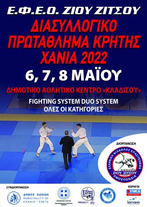 To Διασυλλογικό Πρωτάθλημα Κρήτης Ζίου Ζίτσου από την Ελληνική Φίλαθλο Ερασιτεχνική Ομοσπονδία Ζίου – Ζίτσου (Ε.Φ.Ε.Ο. Ζ-Ζ), θα διεξαχθεί στο Κλειστό Δημοτικό Γυμναστήριο Κλαδισού από σήμερα, Παρασκευή 6 έως και την Κυριακή 8/5/2022, όπως επισημάνθηκε κατά τη διάρκεια Συνέντευξης Τύπου, που παραχωρήθηκε από τους διοργανωτές στο Κλειστό Δημοτικό Γυμναστήριο Κλαδισού.