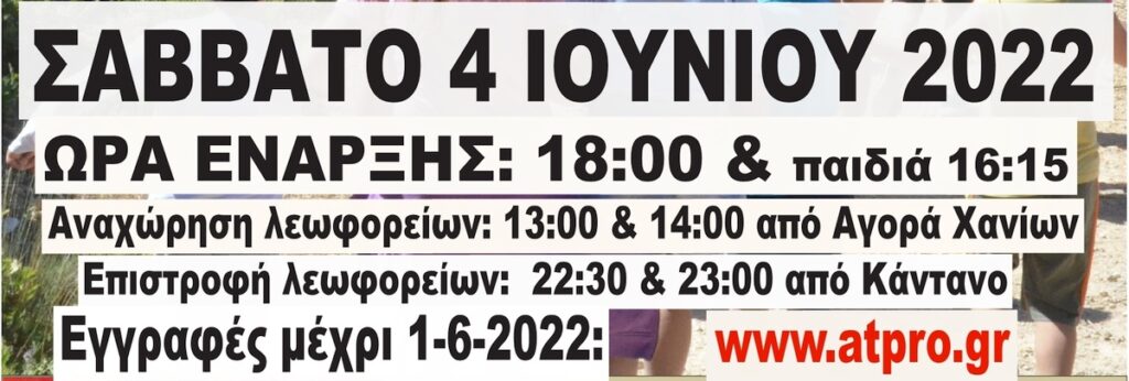 Ολοι οι αγώνες θα γίνουν με ηλεκτρονική χρονομέτρηση με κόστος 5 ευρώ πληρωτέο με την παραλαβή του νούμερου, του chip χρον/τρησης και του μπλουζακιού (το μέγεθος με προτεραιότητα παραλαβής), το Σάββατο 4 Ιουνίου, οι κάτοικοι του δήμου Καντάνου – Σελίνου από 1200 έως 1400 και οι υπόλοιποι από 1400 έως 1530 από την πλατεία Καντάνου.