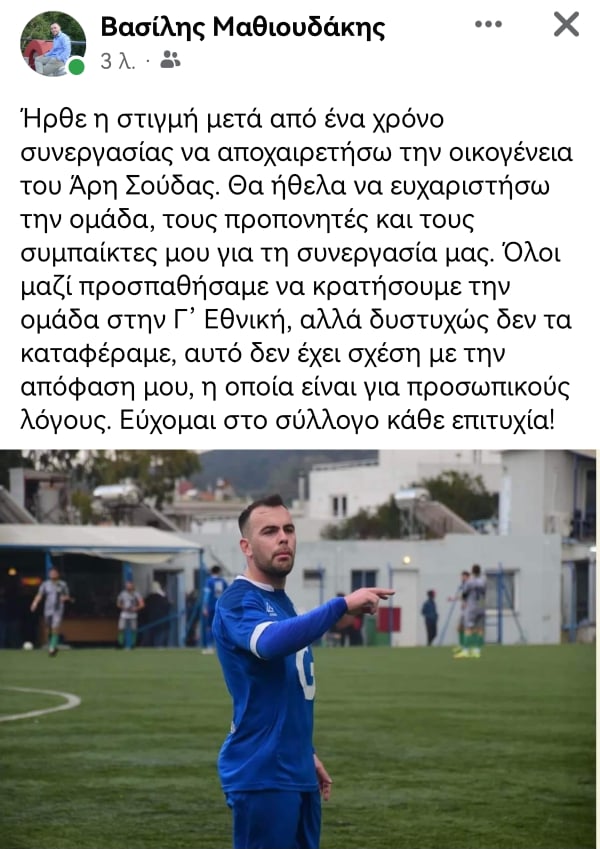 Παρελθόν αποτελεί από τον Άρη Σούδας ο Βασίλης Μαθιουδάκης που ανακοίνωσε την αποχώρηση του μέσω του προσωπικού του λογαριασμού στο Facebook. Ο έμπειρος αμυντικός μέσος που αγωνίστηκε φέτος στο πρωτάθλημα της Γ’ Εθνικής όπως και παλιότερα με την ΑΕΕΚ ΣΥΝΚΑ δεν θα συνεχίσει στην ομάδα της Σούδας ενώ ευχαρίστησε όλο τον οργανισμό του Άρη για την συνεργασία που είχαν.