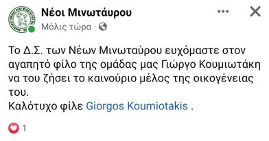 Το Δ.Σ. των Νέων Μινωταύρου ευχόμαστε στον αγαπητό φίλο της ομάδας μας Γιώργο Κουμιωτάκη να του ζήσει το καινούριο μέλος της οικογένειας του. Καλότυχο φίλε
