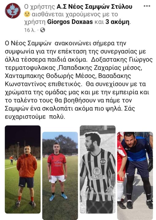 Ο Νέος Σαμψών ανακοινώνει σήμερα την συμφωνία για την επέκταση της συνεργασίας με άλλα τέσσερα παιδιά ακόμα. Δοξαστάκης Γιώργος τερματοφύλακας ,Παπαδάκης Ζαχαρίας μέσος, Χανταμπάκης Θοδωρής Μέσος, Βασαδάκης Κωνσταντίνος επιθετικός. Θα συνεχίσουν με τα χρώματα της ομάδας μας και με την εμπειρία και το ταλέντο τους θα βοηθήσουν να πάμε τον Σαμψών ένα σκαλοπάτι ακόμα πιο ψηλά. Σας ευχαριστούμε πολύ.