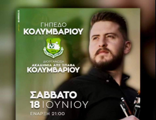Η Ακαδημία ΑΠΣ Σπάθας Κολυμβαρίου σας προσκαλεί στο γλέντι που διοργανώνει το Σάββατο 18 Ιουνίου στο γήπεδο Κολυμβαρίου.