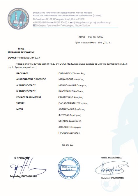 Ο Πηγουνάκης λοιπόν παρέμεινε στην προεδρία του συνδέσμου με τον Νίκο Μαναρώλη να είναι αναπληρωτής πρόεδρος, τον Γιώργο Μανωλακάκη αντιπρόεδρο Α’ και τον Νίκο Καντεράκη αντιπρόεδρο Β΄.