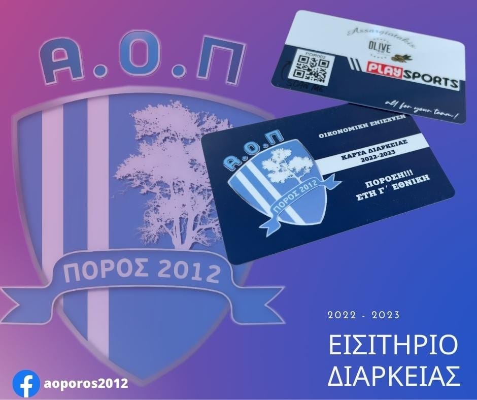 “Έτοιμες οι κάρτες της νέας περιόδου 2022 – 2023 για τους φίλους της ομάδας οι οποίοι θ’ απολαμβάνουν τον Πόρο για τέταρτη συνεχόμενη χρονιά στη Γ’ Εθνική! ΠΟΡΟΣ(Η)… διαρκείας! Περισσότερες λεπτομέρειες για τις τιμές και τον τρόπο διάθεσης των εισιτηρίων διαρκείας της καινούργιας σεζόν θα γίνουν γνωστές από τη διοίκηση το επόμενο διάστημα. Έσω έτοιμοι!”