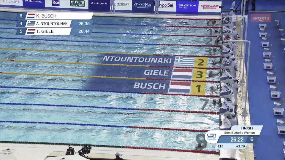 Η Άννα Ντουντουνάκη προκρίθηκε στα ημιτελικά του ευρωπαϊκού πρωταθλήματος της Ρώμης, κατακτώντας την 2η θέση της 2ης προκριματικής σειράς με χρόνο 26.35.