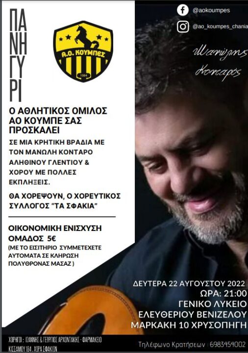 Τη Δευτέρα 22 Αυγούστου 2022 και ώρα 21.00 ο Αθλητικός όμιλος “AO ΚΟΥΜΠΕ” σας προσκαλεί σε μια κρητική βραδιά με τον Μανώλη Κονταρό, αληθινού γλεντιού & χορού με πολλές εκπλήξεις.