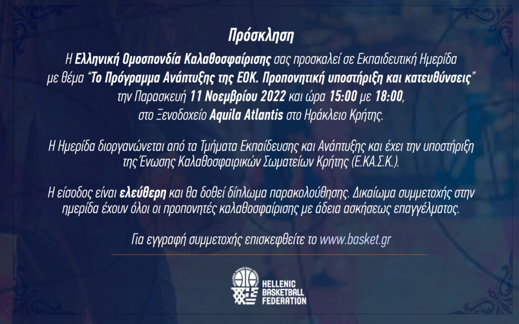 *Όσοι προπονητές παρακολουθήσουν το σεμινάριο μπορούν να λάβουν δωρεάν ένα εισιτήριο για τον αγώνα Ελλάδα – Λετονία στο τέλος της ημερίδας.
