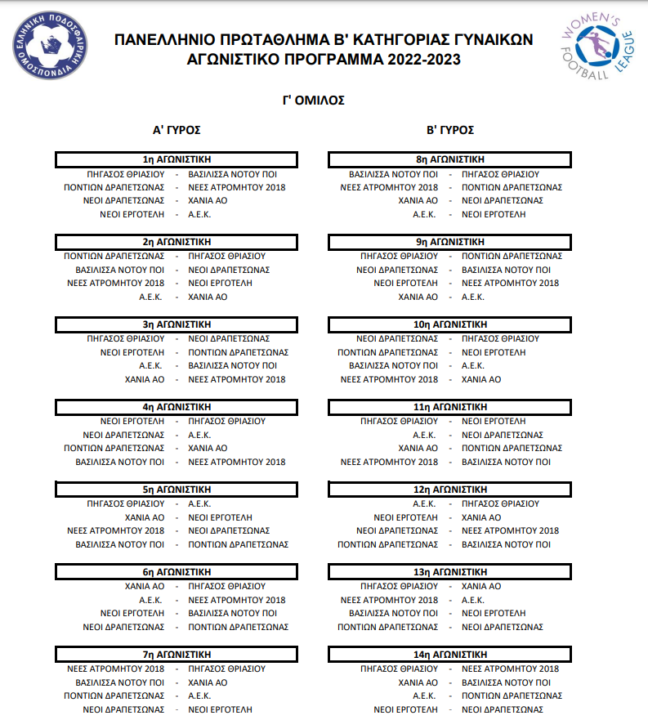 Παράλληλα, μαζί με το ΑΟΧ, τους αντιπάλους καθώς και όλο το πρόγραμμα του 3ου ομίλου της Β΄Εθνικής Γυναικών έμαθαν και οι Νέοι Εργοτέλη όπου θα φιλοξενήσουν την ΑΕΚ και η Βασίλισσα Νότου όπου θα πάει στην έδρα του Πήγασου Θριάσου.