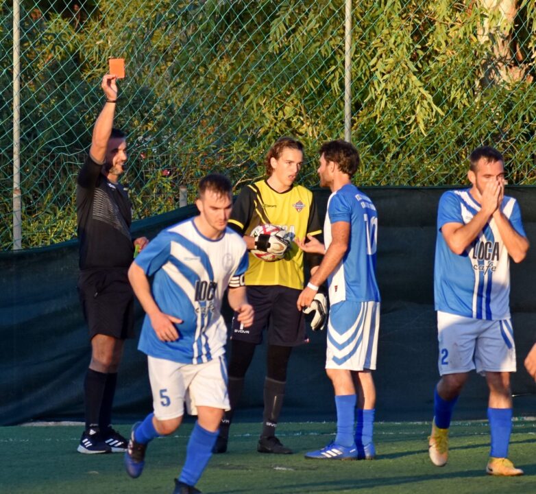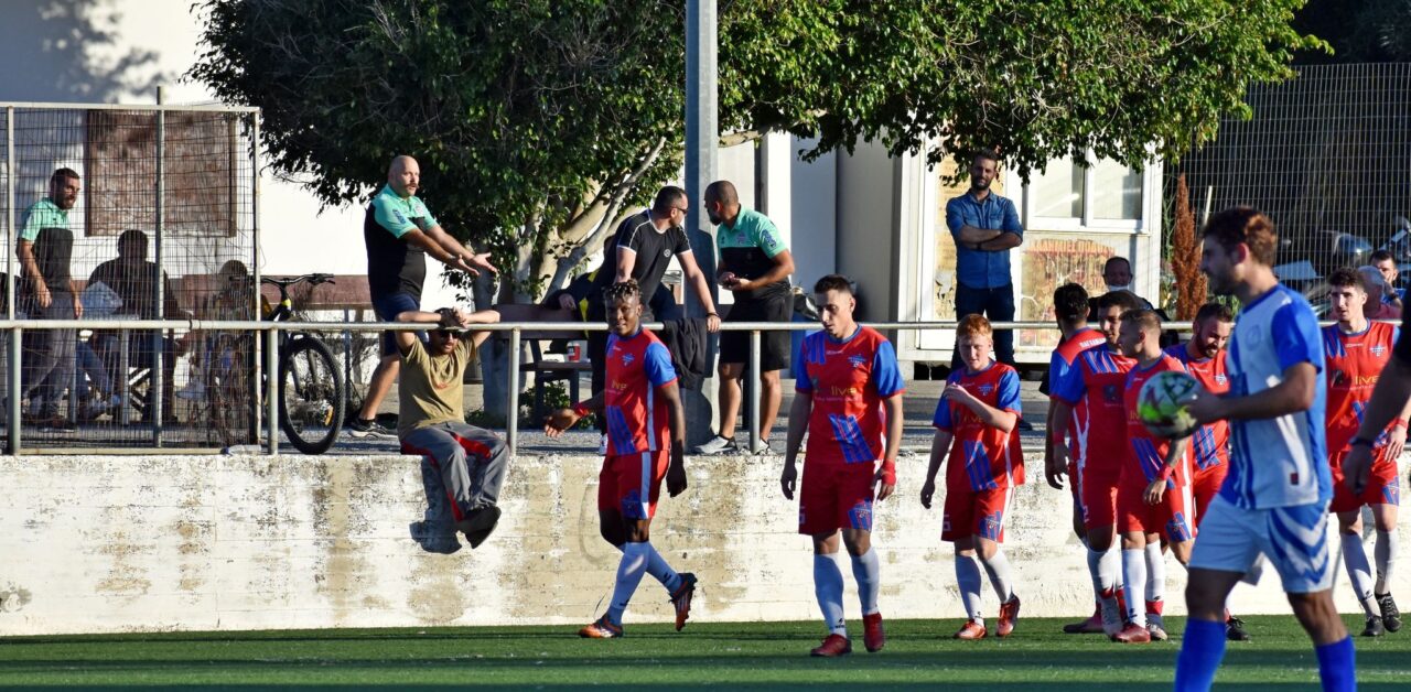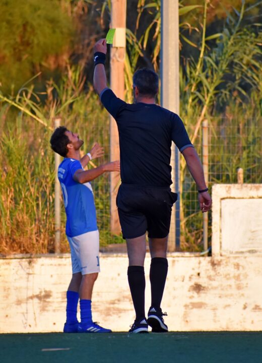 Η στιγμή όπου ο διαιτητής δείχνει την κόκκινη κάρτα στον Γιάννη Γεωργανά για μαρκάρισμα εκτός φάσης στον τερματοφύλακα του Παγχανιακού/ΔΑΑΟΧ Γυπαράκη.