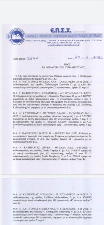 Με 3 αγωνιστικές τιμωρήθηκε ο Σαντσόλλι της Παλαιόχωρας, για την αποβολή του δέχθηκε στο ματς με την Θύελλα Καλαθενών, από δύο αγωνιστικές “έφαγαν” Ποθητός και Παπαδάκης στην Γ’ Κατηγορία, ενώ το ποινολόγιο της ΕΠΣ Χανίων περιλαμβάνει ακόμη κλήσεις σε απολογία.