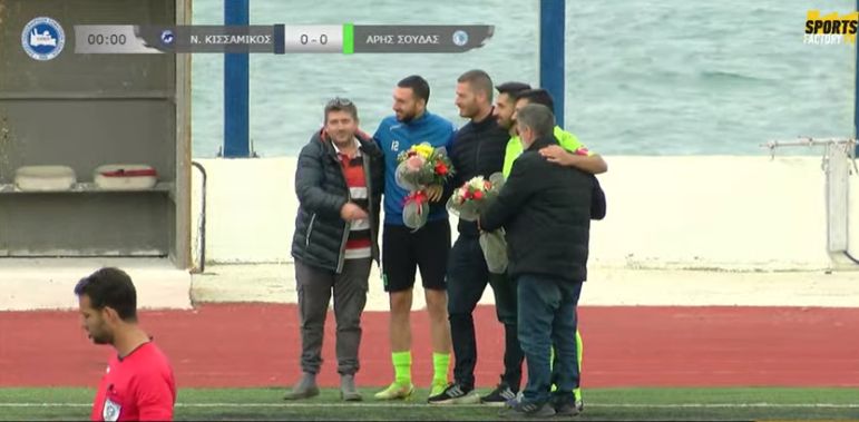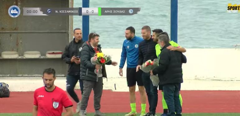 Ο πρόεδρος του Νέου Κισσαμικού, Αντώνης Σταθόπουλος και ο Γενικός Αρχηγός της ομάδας Μανώλης Ασγουδάκης, έδωσαν ανθοδέσμες στους 4 ποδοσφαιριστές, σε μια πολύ ωραία κίνηση.
