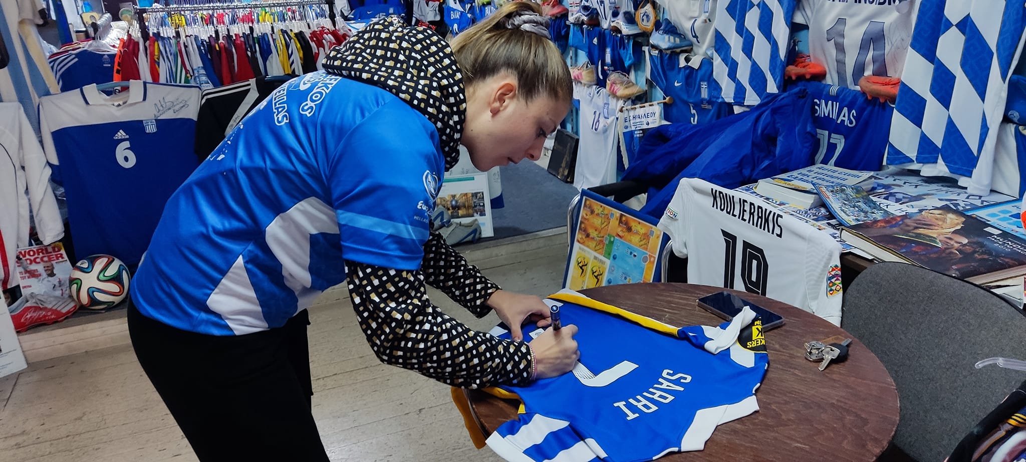 Η Βεατρική Σαρρή βρέθηκε στο Μουσείο του Γαλανόλευκου Φάρου και άφησε την φανέλα της με το εθνόσημο αλλά και εκείνο του συλλόγου με τον οποίο διαφημίζει τα Χανιά και την Κρήτη στην Αγγλία.