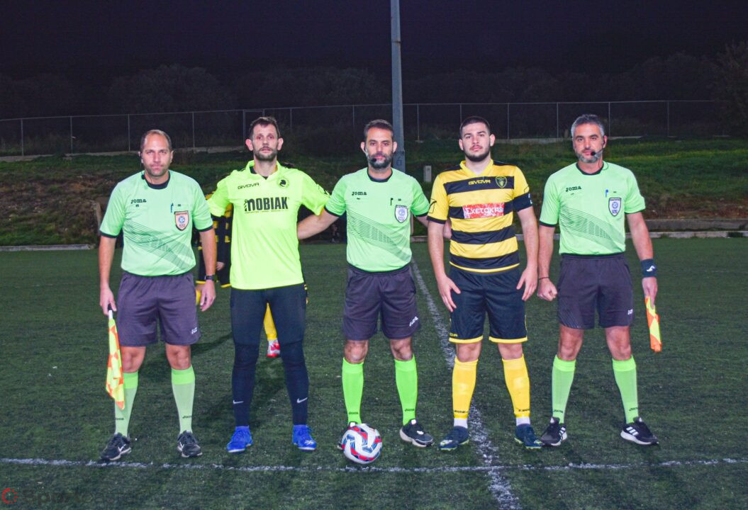 Οι δυο ομάδες και οι διαιτητές της αναμέτρησης Γιαννουλάκης και Κανελάκης – Μαρκετάκης, με τους αρχηγούς Ρωμανιά και Παλαθούρα