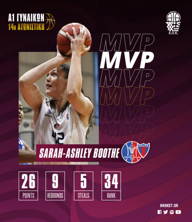 Σε MVP της 14ης αγωνιστικής της Α1 μπάσκετ Γυναικών αναδείχθηκε η Σάρα Μπουθ του Πρωτέα Βούλας.