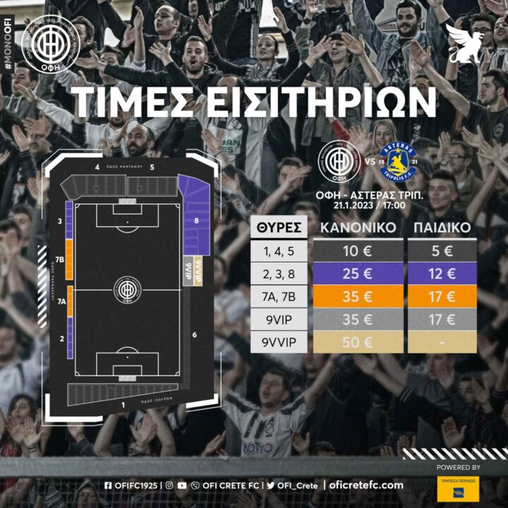 Ο ΟΦΗ γνωστοποίησε πως βρίσκονται σε κυκλοφορία τα εισιτήρια για το παιχνίδι του Σαββάτου(21/1, 17:00) απέναντι στον Αστέρα Τρίπολης για την 18η αγωνιστική, η τιμή των οποίων ξεκινά από τα 10 ευρώ.