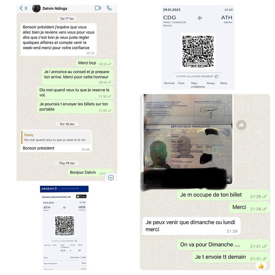 Ο Α.Ο. Πόρου είχε προαναγγείλει από την Κυριακή το βράδυ (29/01) ότι θα δημοσιοποιήσει τα στοιχεία των συνομιλιών του προέδρου της ομάδας Γιάννη Ασσαργιωτάκη με τον ποδοσφαιριστή και της θετικής απάντησης του τελευταίου στην πρόταση που του έγινε. Όλες οι αποδείξεις για την συμφωνία του Πόρου με τον Ντελβίν Εντινγκά! Τα μηνύματα που αντάλλαξαν στα γαλλικά οι δύο πλευρές, το διαβατήριο που έστειλε ο παίκτης στον πρόεδρο για να εκδοθούν τα εισιτήριά του και η ημέρα και ώρες των πτήσεων από Παρίσι μέσω Αθηνών στο Ηράκλειο (διακρίνονται ξεκάθαρα στη φώτο κάτω αριστερά και πάνω δεξιά).