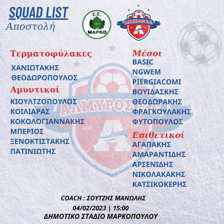 Ειδικότερα, ο τεχνικός της ομάδας Μανώλης Σούτζης θα έχει στην διάθεσή του στο σύνολο 20 ποδοσφαιριστές για το δύσκολο εκτός έδρας ματς με την Μαρκό.