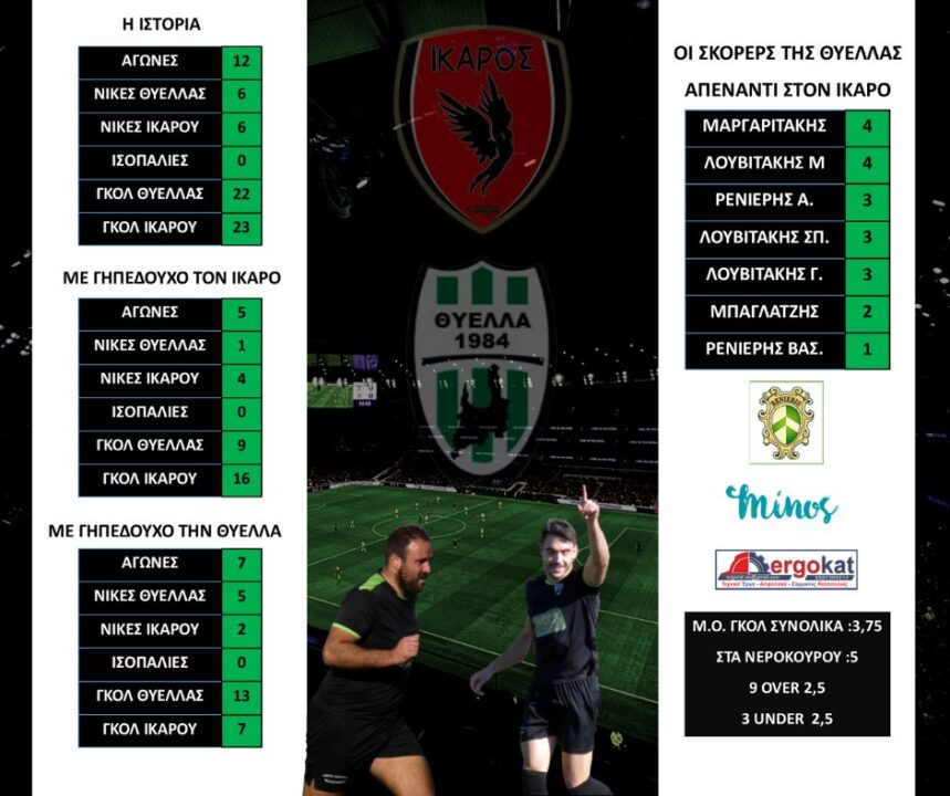 Εκεί παρατηρείται η απόλυτη ισορροπία, καθώς στα τελευταία 12 μεταξύ τους παιχνίδια δεν υπήρξε καμία ισοπαλία, με τις δύο ομάδες να μετρούν από 6 νίκες, αλλά και πολλά γκολ, καθώς στα 12 αυτά ματς έχουν σημειωθεί 45 γκολ, κάτι που σημαίνει πως πετυχαίνουν σε μέσο όρο 3,75 γκολ ανά ματς, με τον αριθμό να αυξάνεται, όταν ο Ίκαρος αγωνίζεται στην έδρα του.