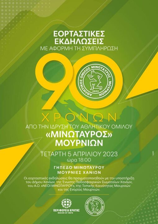 Την Τετάρτη στις 5 Απριλίου θα πραγματοποιηθούν οι εορτασμοί για τα 90ά γενέθλια του Μινωταύρου, ημέρα που θα γίνει και η ονοματοδοσία του γηπέδου των Μουρνιών, που θα ονομαστεί “Ελευθέριος Πατακάκης”.