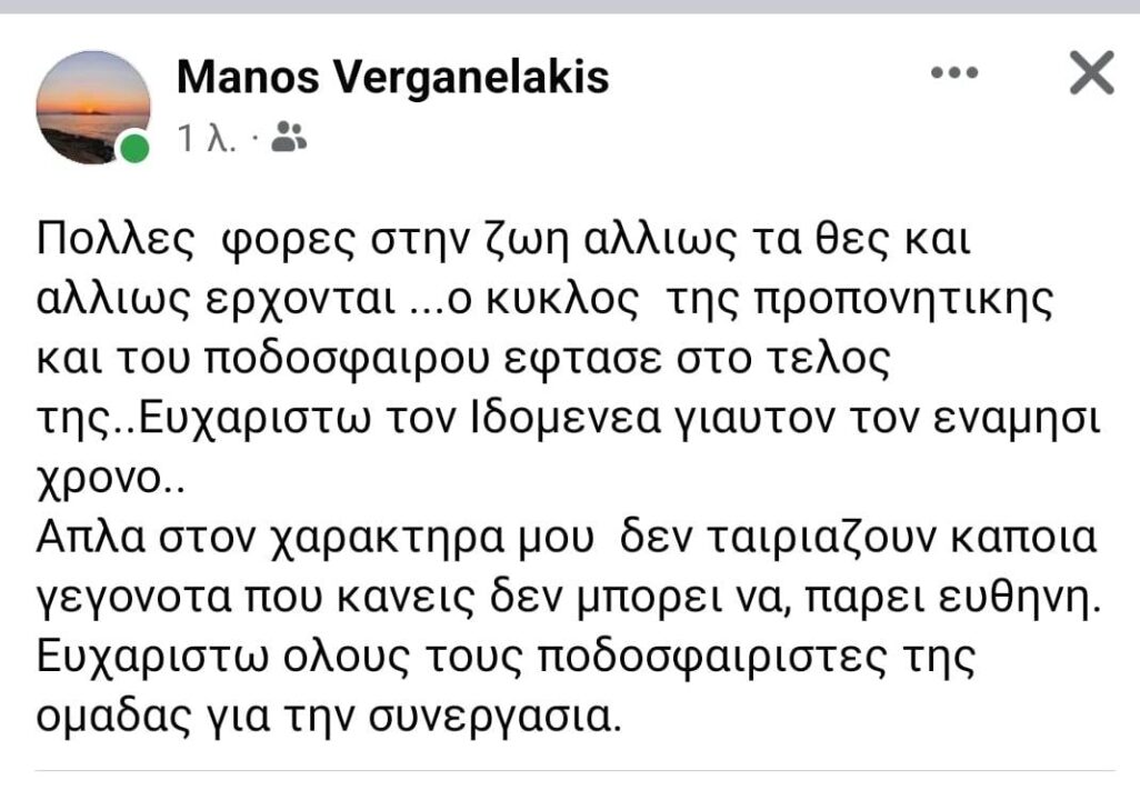 Τέλος από τον Ιδομενέα ο Μάνος Βεργανελάκης, καθώς ο Χανιώτης τεχνικός με δημοσίευση του έκανε γνωστή την αποχώρηση του από την ομάδα του Γαλατά, στην οποία εργάστηκε τον τελευταίο ενάμισι χρόνο.