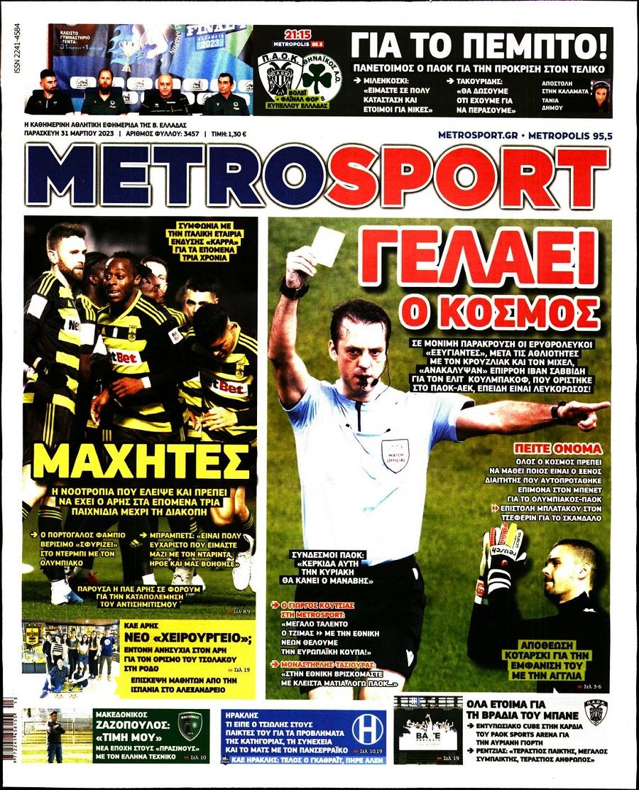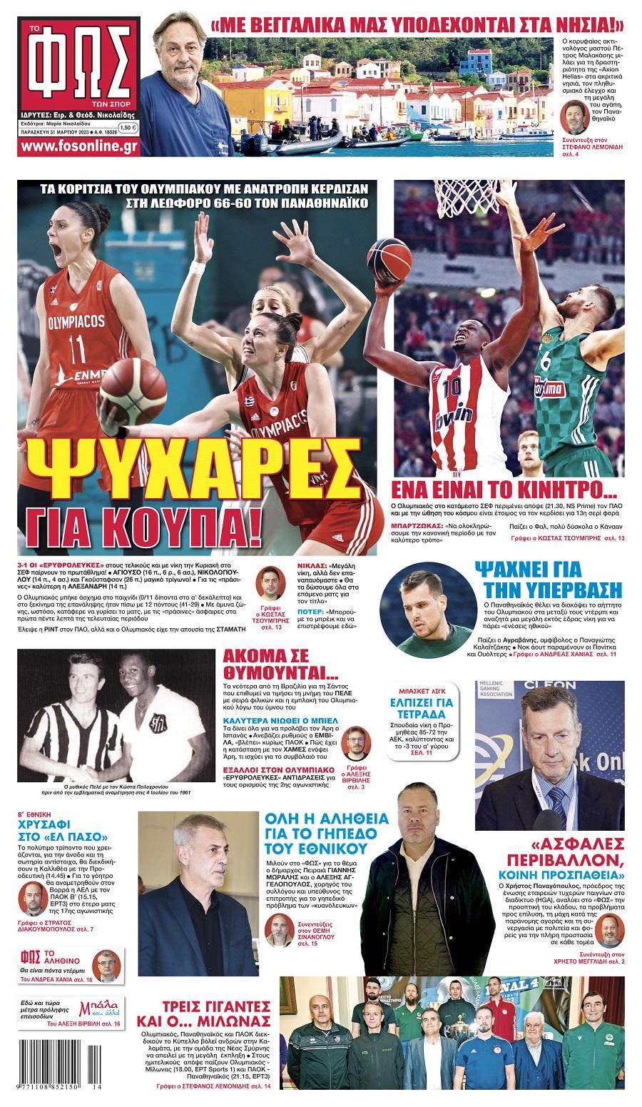 Τα αθλητικά πρωτοσέλιδα της ημέρας(31/03)