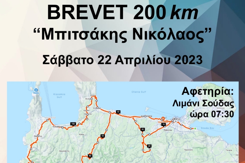 Το Brevet 200 χιλιομέτρων θα γίνει στα Χανιά, και θα συνδυάσει μερικά από τα πιο όμορφα ασφάλτινα κομμάτια του νομού. Η όμορφη ποδηλατική διοργάνωση διεξάγεται για πρώτη φορά στην Κρήτη και σκοπός είναι να τιμηθεί η μνήμη του αθλητή ποδηλασίας Νίκου Μπιτσάκη, που έφυγε από την ζωή τον Φεβρουάριο του 2022. Ο άτυχος αθλητής καταπλακώθηκε από έναν τοίχο, ο οποίος κατέρρευσε από παλαιό κτίσμα στο κέντρο της Λάρισας όπου πραγματοποιούσε τις σπουδές του.