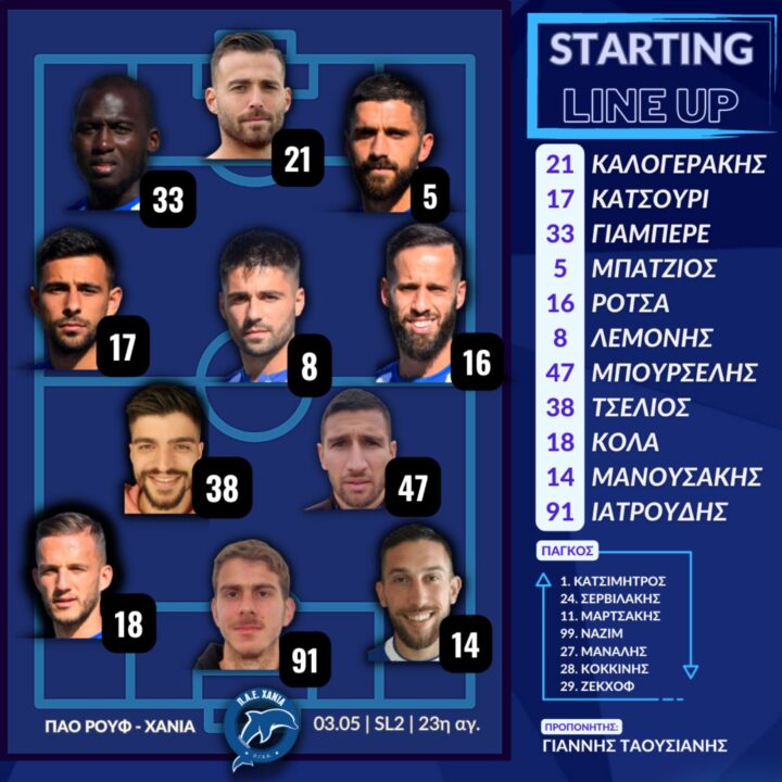 Χανιά (Γιάννης Ταουσιάνης): Καλογεράκης, Κατσούρι (71’ Ζέκχοφ), Ρότσα, Μπάτζιος (68’ Ναζίμ), Γιαμπερέ, Λεμονής, Τσέλιος, Μπουρσέλης (68’Μαρτσάκης), Μανουσάκης, Κόλα (60’ Κοκκίνης), Ιατρούδης (60’ Μάναλης)
