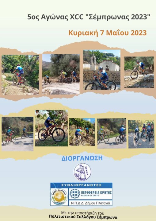 “Ο ΚΥΔΩΝ” (τμήμα ποδηλασίας), την Π.Ε. Χανίων και τον Πολιτιστικό Σύλλογο Σέμπρωνα, συνδιοργανώνουν την Κυριακή 7 Μαΐου τον Ποδηλατικό Αγώνα ΜΤΒ (MOUNTAINBIKE), ΣΕΜΠΡΩΝΑΣ 2023.