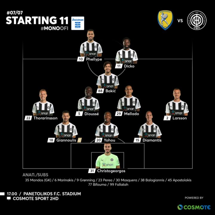 Από εκεί και πέρα, στην τριάδα της άμυνας ξεκινούν οι Γιαννούλης, Γιοχού και Διαμαντής, ενώ στο αριστερό άκρο της άμυνας βρίσκεται ο Τοράρινσον, με τον Λάρσον δεξιά. Ντιουσέ και Μεγιάδο στη μεσαία γραμμή, μπροστά τους ο Μπάκιτς, και στην επίθεση ξεκινούν οι Ντίκο και Φελίπε.