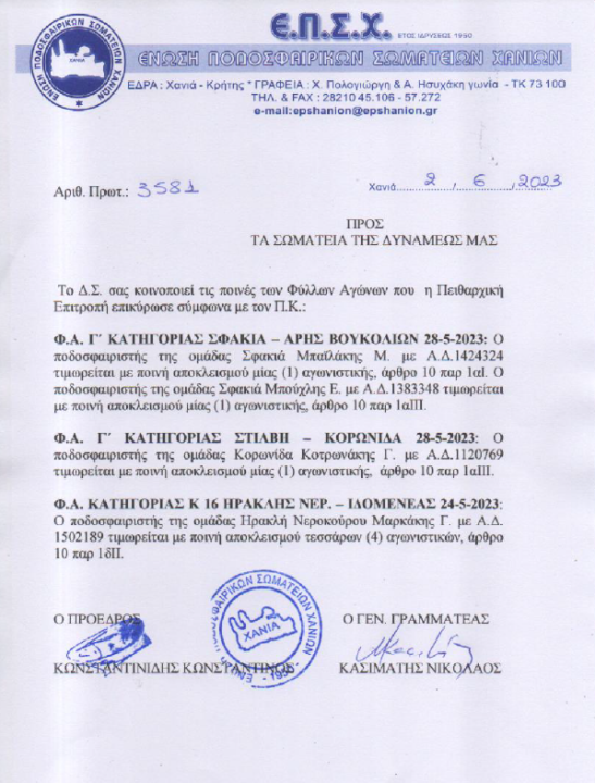 Η Ένωση γνωστοποίησε το τελευταίο ποινολόγιο της φετινής σεζόν, το οποίο αφορά την Γ’ κατηγορία και το πρωτάθλημα Κ16.