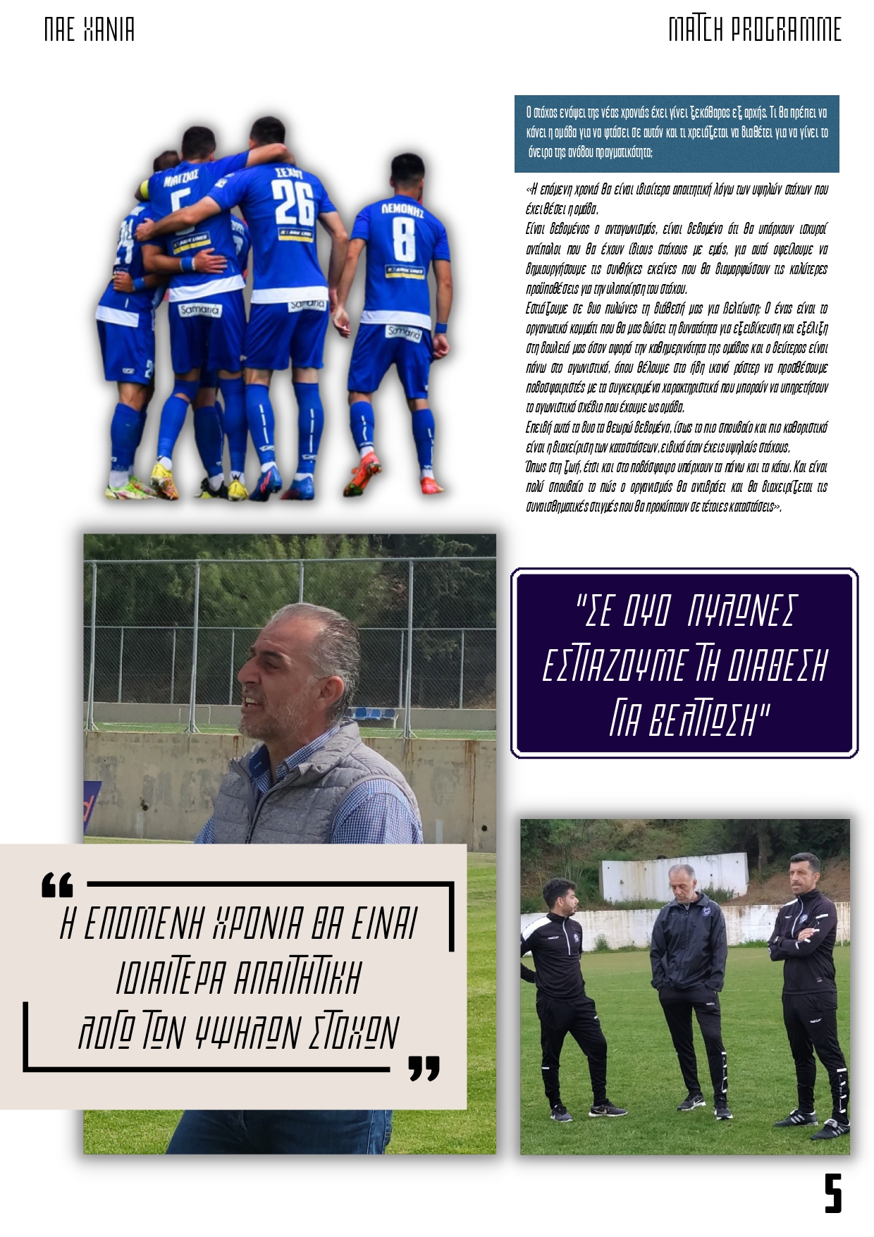 Η επόμενη χρονιά θα είναι ιδιαίτερα απαιτητική λόγω των υψηλών στόχων που έχει θέσει η ομάδα. Είναι δεδομένος ο ανταγωνισμός, είναι δεδομένο ότι θα υπάρχουν ισχυροί αντίπαλοι που θα έχουν ίδιους στόχους με εμάς, για αυτό οφείλουμε να δημιουργήσουμε τις συνθήκες εκείνες που θα δώσουν τις καλύτερες προϋποθέσεις για την υλοποίηση του στόχου. Εστιάζουμε σε δυο πυλώνες την διάθεσή μας για βελτίωση. Ο ένας είναι το οργανωτικό κομμάτι που θα μας δώσει τη δυνατότητα για εξειδίκευση και εξέλιξη στη δουλειά μας όσον αφορά την καθημερινότητα της ομάδας και ο δεύτερος είναι πάνω στο αγωνιστικό, όπου θέλουμε στο ήδη ικανό ρόστερ να προσθέσουμε ποδοσφαιριστές με τα συγκεκριμένα χαρακτηριστικά που μπορούν να υπηρετήσουν το αγωνιστικό σχέδιο που έχουμε ως ομάδα. Επειδή, αυτά τα δυο τα θεωρώ δεδομένα, ίσως το πιο σπουδαίο και πιο καθοριστικό είναι η διαχείριση των καταστάσεων, ειδικά όταν έχεις υψηλούς στόχους. Όπως στη ζωή έτσι και στο ποδόσφαιρο υπάρχουν τα πάνω και τα κάτω, κι είναι πολύ σπουδαίο το πως ο οργανισμός θα αντιδράει και θα διαχειρίζεται τις συναισθηματικές στιγμές που θα προκύπτουν σε τέτοιες καταστάσεις.